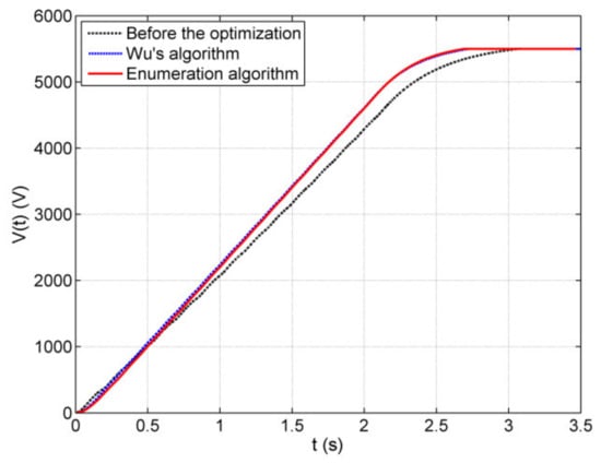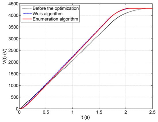 The comparison of the charging current-time and charging voltage-time curves of the pulse capacitor of the two algorithms are presented in Figure 9 and Figure 10, respectively. As shown in Figure 9, unlike Wu’s algorithm, the first peak value of the charging current of the Enumeration algorithm is 1155 A, and does not reach the required maximum charging current 1250 A. Furthermore, except for the first peak value, all the other peak values reach the required maximum charging current. The charging current of the Enumeration algorithm has more minor fluctuations and is closer to a constant value. These results indicate that the constraint condition that the first peak value of the charging current needs to reach a specified value is unreasonable. It limits the optimal design of the circuit. Specifically, it limits the design of the current-limiting inductor and is unable to obtain a better solution.