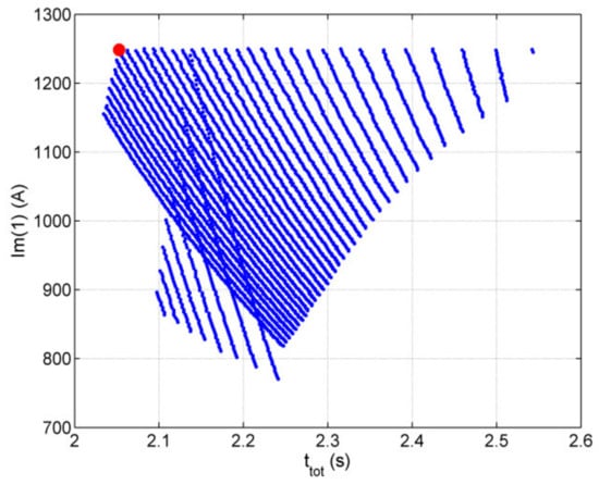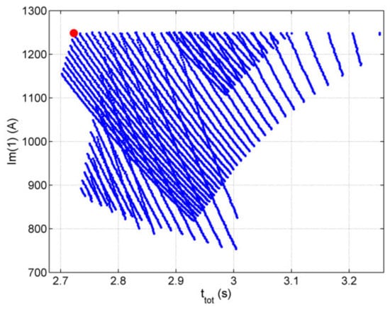 We also have studied the relationship between the first peak value of the charging current and the total charging time for all feasible solutions of the Enumeration algorithm (see Figure 11). Among these solutions, the minimum total charging time, with the constraint that the first peak value of the charging current needs to reach a specified value, ranks 59th if the charging time is arranged in ascending order. It is shown by the big red dot in Figure 11.