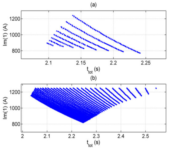 Figure 12 contains the plots of the relationship between the first peak value of the charging current and the total charging time for the two battery pack structures in the Enumeration algorithm’s feasible solutions, respectively. Both results show that the corresponding solutions where the first peak value of the charging current is constrained are not the optimal solution.