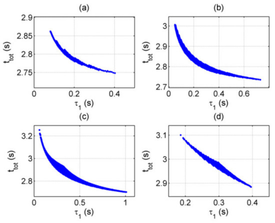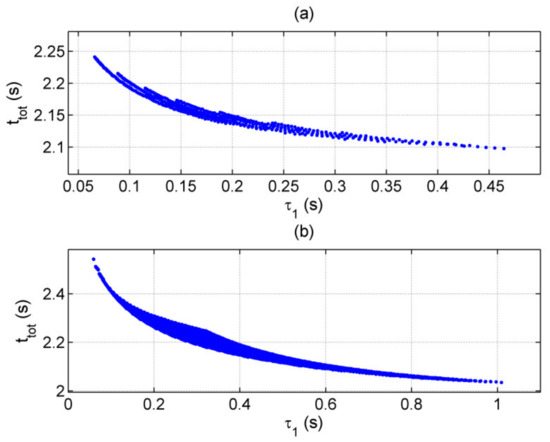 Furthermore, the relationship between the total charging time and the time constant for the two battery pack structures in the feasible solutions of the Enumeration algorithm are presented in Figure 13, respectively. From the figures, the total charging time shows a decreasing trend, with the increase of the time constant , for both battery pack structure conditions.