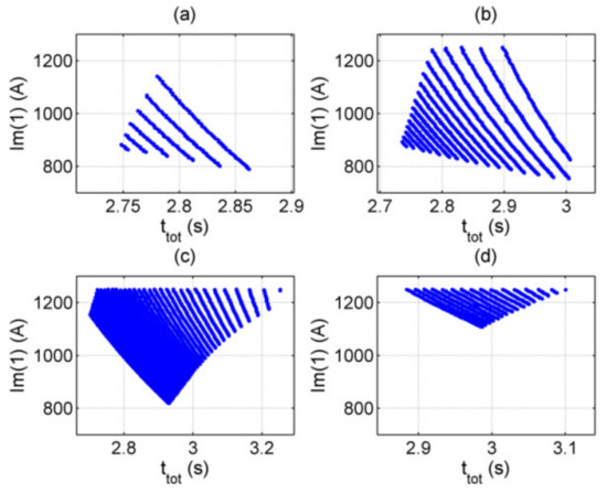 Figure 18 contains the plots of the relationship between the first peak value of the charging current and the total charging time for the four battery pack structures in the Enumeration algorithm’s feasible solutions, respectively. The first three results show that the corresponding solutions, where the first peak value of the charging current is constrained, are not the optimal solution, and only the last result is an exception (see Figure 18d). It is just a coincidence.