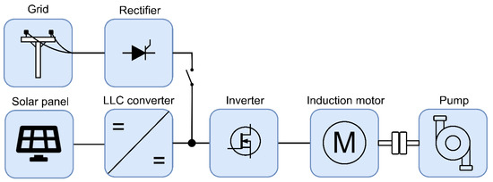 - Shukla, S.; Singh, B. Grid-PV Array Fed Induction Motor Drive for Water Pumping. In Proceedings of the 2018 IEEE International Conference on Power Electronics, Drives and Energy Systems (PEDES), Madras, India, 18–21 December 2018; p. 6. [Google Scholar]
