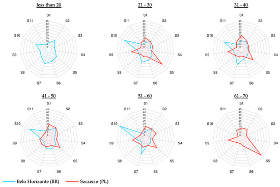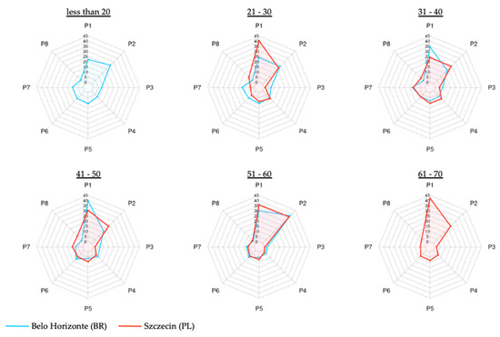 Table 4 and Table 5 show the estimated rank of urban mobility problems based on age, with more respondents in Belo Horizonte and Szczecin. Figure 1 shows (in radar chart form) the “Pi” values for each of the age ranges in the cities under analysis. Residents less than 20 years old are more worried about the low quality of public transportation (P2) in Belo Horizonte. From 21 to 50 years old, the main worries are congestion (P1) and the low quality of public transportation (P2) in Belo Horizonte. The position of these problems reverses for Szczecin’s interviewees. The low quality of public transportation is the principal concern of 51–60-year-olds in Belo Horizonte and Szczecin, and the main worry of respondents older than 60 years old, followed by congestion. Based on age, urban freight transport is a minor problem in Belo Horizonte and an intermediary problem in Szczecin, since the rank varies according to the age of respondents. Results indicate a low influence of age on the ranking of urban mobility problems.