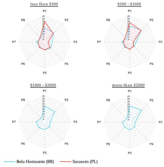 Table 6 and Table 7 show the estimated rank of urban mobility problems based on income, with more respondents. Figure 2 shows the chart of the “Pi” values for each range. Urban mobility problems also vary among congestion and the low quality of public transportation in Brazil. In contrast, congestion is the primary concern followed by the low quality of public transportation in Szczecin. Urban freight transport still attracts minor concerns among the respondents from Brazil and those with income less than $500 in Szczecin. Respondents with incomes of more than $500 ranked urban freight transport in fourth place. Results show that the income of respondents has little influence on the residents’ perception in Brazil and Poland. These results confirm hypotheses (ii) and (iii).