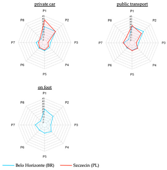 Table 10 and Table 11 show the estimated rank of urban mobility problems based on the transportation mode used for trips (work and school). Figure 4 shows a chart of the “Pi” values. Congestion and the low quality of public transportation are the two main problems for all transportation modes in both cities. In Belo Horizonte, urban freight transport is still a minor concern, while it is an intermediary concern in Szczecin. Results indicate that transportation mode creates awareness among the respondents concerning congestion as an urban mobility problem, corroborating hypothesis (iii).