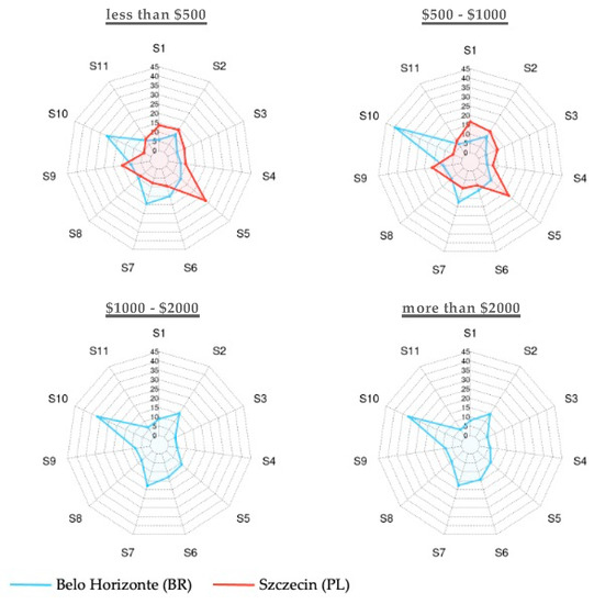 Table 15 and Table 16 show the estimated rank of UFT solutions based on income with more respondents, and Figure 6 shows the chart of the “Pi” values for each range. A similar trend to that of age was observed by analysing the income. An urban mobility plan is the most suitable solution for the respondents in Belo Horizonte, while the cargo bike is the solution preferred by the respondents in Szczecin.