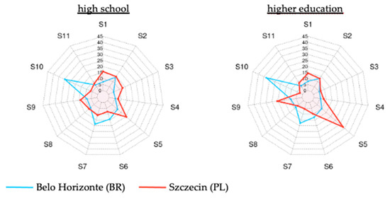 Table 8 and Table 9 show the estimated rank of urban mobility problems based on the education level of respondents, and Figure 3 shows the radar graph. Based on the education level of respondents, the main concern is congestion followed by the low quality of public transportation in both Belo Horizonte and Szczecin. On the other hand, urban freight transport is a minor concern for the Belo Horizonte respondents based on their education level. At the same time, this problem is in the fifth and sixth positions for the high school and higher education levels, respectively, in Szczecin. Therefore, the education level has a minor influence on urban mobility problems.