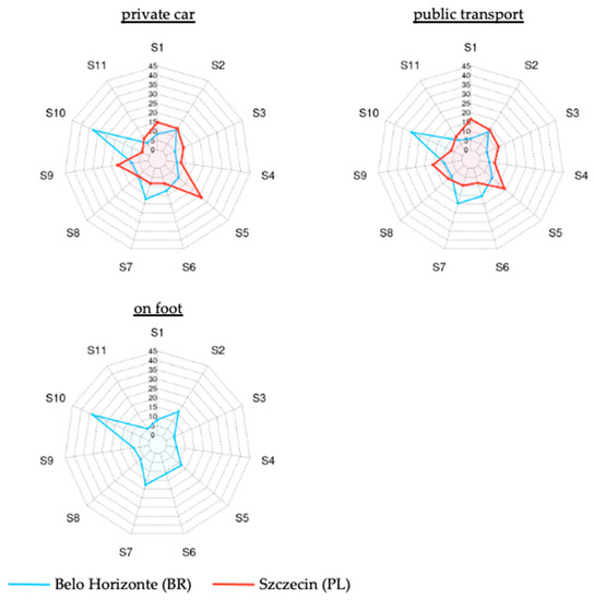 Table 2 shows the descriptions of respondents. Most respondents are younger in Belo Horizonte (less than 30 years old). In Szczecin, most respondents are between 41–50 years old. Most respondents have an income below $1000 in Szczecin and lower than $1000 in Belo Horizonte. A private car is used for work/school trip purposes in both cities. As mentioned earlier, the sampling procedure was for convenience. Thus, the groups do not represent the populations of the cities analysed. In this way, the results represent what respondents said. Furthermore, the results might provide insights for future investigations involving this important UFT stakeholder.