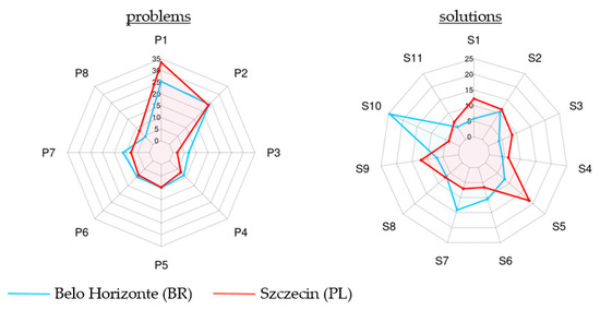 Residents’ perceptions are essential to public authorities. In addition, considering the opinion of residents in public transport policies is a way to achieve greater acceptability of them. The findings of this paper indicate an awareness of respondents regarding the congestion and low quality of public transportation. Regarding UFT solutions, urban mobility plans and cargo bikes are the most prominent solutions for Belo Horizonte and Szczecin, respectively. Figure 9 compares the global results from each city.