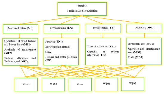 The structure between criteria, sub criteria and turbine suppliers.