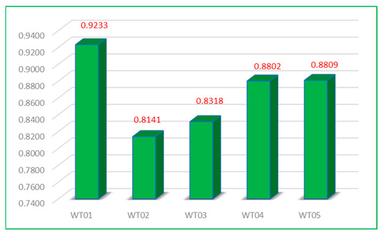 In this research, the authors proposed a hybrid model of the SF-AHP and WASPAS concepts to develop a decision support system in wind turbine supplier selection processes. A SF-AHP was applied to determine the weight of all criteria in the first stage, and the WASPAS model was then used for ranking all potential suppliers in the final stage. The aggregated utility function value Qi was calculated using weighted sum mode Qi1 (WSM) and weighted product model Q12 (WSM), as can be seen in Table 6. From the results in Figure 3, the top three turbine suppliers were WT01, WT05, and WT04, with scores of 0.9233, 0.8809, and 0.8802, respectively. Thus, supplier 01 (WT01) is the optimal supplier.