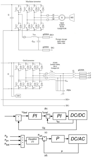 Scheme of the (a) microgrid, (b) inverters, (c) DC bus control system, and (d) grid inverter power control system.