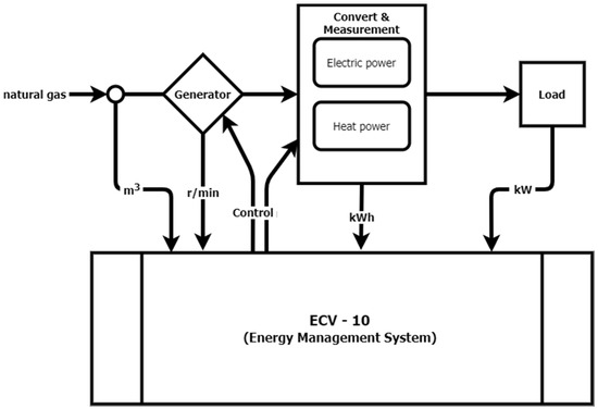 Assuming that the cogeneration system can only operate at the constant rotor speed of the generator, a constant power supply to the microgrid requires developing a new dedicated control system. The islanding mode of microgrid operation is not allowed by the basic control algorithm in these conditions. In accordance with the adopted assumptions and requirements, a new control system was developed that is able to operate in islanding mode by implementing a variable speed control system for the generator with efficiency optimization of energy conversion in the microgrid. The management of the energy generated and consumed by the microgrid is to be ensured, along with efficiency optimization of all microgrid subsystems. This is achieved by the development of a control system based on the energy management system implemented by the company (ECV–10), which, along with measurements of various physical quantities of the cogeneration system, allows the determination of the reference value for the generator rotor speed in the control system that will satisfy the requirements for electrical and thermal power. A brief description of the procedure to determine the efficiency is shown in Figure 4. This procedure ensures obtaining maximum efficiency of cogeneration using the efficiency hill ἠ determined for the microgrid system in experimental tests of the cogeneration system operation range. On the basis of the acquired results, the optimal operating conditions of the connection and interchangeability of energy with the available rural grid were included in the control system. The efficiency hill of the cogeneration system (CHP) is the maximum efficiency derived from three variables: the generator rotational speed “V”, related to fuel consumption; the maximum heat power “PH”; and the electrical power “PE”. It is defined as follows: