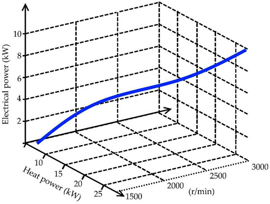 where is the amount of natural gas related to the current rotational speed and is the calorific value of natural gas (this parameter is assumed to be constant during system operation). Equation (1) allows the calculation of the efficiency hill from several real-time measurements of electrical and thermal energy, fuel consumption, and rotational speed, conducted using the experimental set-up shown in Figure 4. Based on the results obtained in the experimental tests, the efficiency hill was determined as illustrated in Figure 5. Generally, the efficiency increases as the power and rotational speed increase; however some exceptions were identified. The algorithm for efficiency determination is reported in [22]. Figure 6 presents the obtained curve reflecting the relation between electrical and thermal power in the cogeneration system. The average values of thermal and electric power shown in Figure 6 were measured with a sampling period of T_s = 10 min.