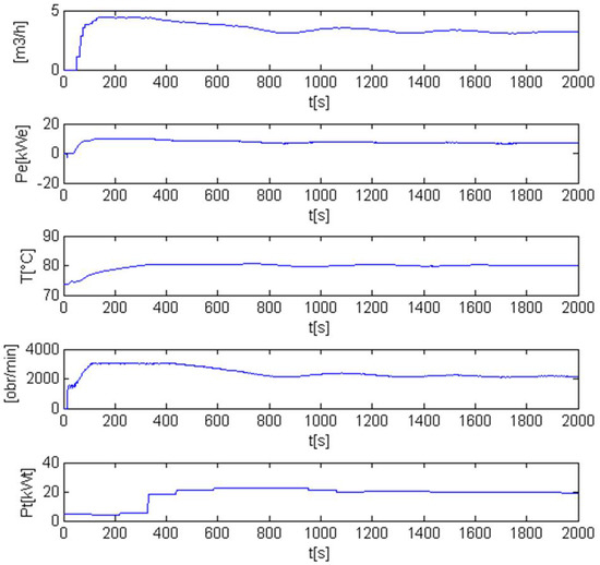 Figure 7 shows the controlled state variables in the optimal efficiency hill tracking mode when the cogeneration system reaches the reference temperature of 80 °C (Tref), starting from the initial temperature of 73.5 °C. The cogeneration system engine starts up and rapidly reaches a speed of 3000 rpm, which ensures a rapid increase in the temperature of the heat exchanger, where the desired temperature is attained within 300 s and kept stabilized at the reference value. The natural gas consumption increases during the transient state of temperature increase, and the thermal and electrical power increases as well.