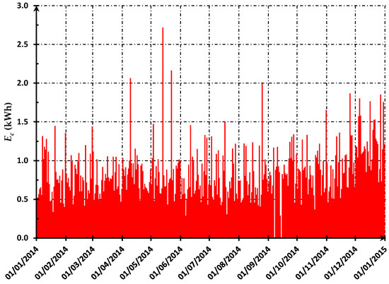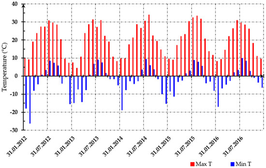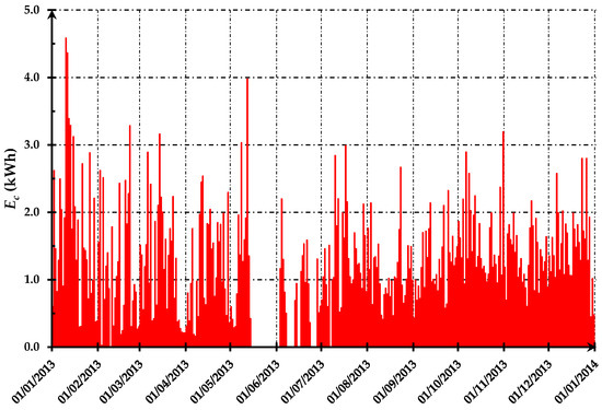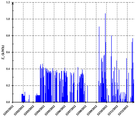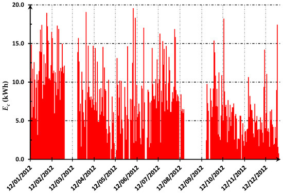 The developed energy management system presented in Figure 9 has the functionality of data archiving. The microgeneration system was investigated for 5 years. Various algorithms of the energy management system were tested, along with different operational modes [23]. A selection of data on the consumed and generated energy, as well as other factors affecting the assessment of the implemented EMS, is presented in Table 1. Relative total energy balance analysis in years 2012–2016 is presented in Table 2. For 2 years, long-term studies were carried out based only on the renewable energy acquisition systems with minimal use of the cogeneration system, the latter being initiated only for testing purposes. All predicted operation conditions were experimentally tested including the on-grid and islanding operation modes. Moreover, failure modes were simulated and diagnostic functionalities were tested. During the testing period, failure modes and safety shut-down procedures were identified and analyzed, including those resulting from atmospheric phenomena and rural power system failures. The summary of the supplied and consumed energy, with source distinction, is given in Table 1. Figure 10, Figure 11, Figure 12, Figure 13, Figure 14 and Figure 15 show the data obtained in years 2012–2014 of the energy supplied to and consumed from the rural power system. These figures illustrate various modes of operation. It can be clearly noted that the much higher demand of energy observed in 2012 is due to the assembly and construction works carried out on the site, as shown in Figure 10. In the following years, the assembly work was already finished. In 2014–2015, the research was conducted assuming no cogenerator operation, as it was turned-on only occasionally. Figure 16 shows the maximum and minimum temperatures in the area of the company location, based on the measurements performed by the meteorological station located at Rębiechowo and owned by the IMGW (Polish Institute of Meteorology and Water Management—National Research Institute). The data was presented to indicate that in the observed period, the microgeneration grid was operated under temperature conditions typical for the geographical area of northern Poland where the company is located.