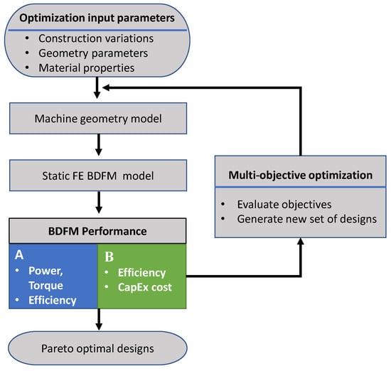 - Strous, T.D.; Wang, X.; Polinder, H.; Ferreira, J.A.B. Finite element based multi-objective optimization of a brushless Doubly-Fed Induction Machine. In Proceedings of the 2015 IEEE International Electric Machines Drives Conference (IEMDC), Coeur d’Alene, ID, USA, 10–13 May 2015; pp. 1689–1694. [Google Scholar] [CrossRef]