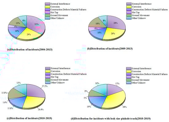 Distribution of incidents: (a) 2004–2013; (b) 2009–2013; (c) 2010–2019; (d) with leak size pinhole/crack (2010–2019).