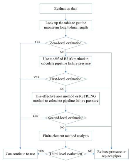 Based on the previous two editions of ASME B31G, the criterion was revised again in 2009 and ASME B31G-2009 was obtained [6]. This version adopts the concept of hierarchical evaluation for the first time (Figure 2). The higher the evaluation level, the more accurate the evaluation result. However, the difficulty of evaluation also increases [7]. Therefore, different levels of the evaluation methods should be selected according to the actual situation in the application.