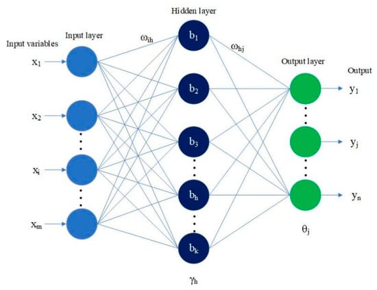In Figure 3, the neural network includes input layer, hidden layer, and output layer. Suppose a training sample is x = (x1, x2, x3, …, xm) ∈ Rm, the corresponding output vector is y= (y1, …, yn), and n is the number of categories. Each neuron has a weight. The input weight of the nth node of the hidden layer is , and the corresponding offset is . The input weight of the jth output layer node is , and the corresponding offset is . k is the number of hidden layer nodes. In addition, the hidden layer can be multiple layers.