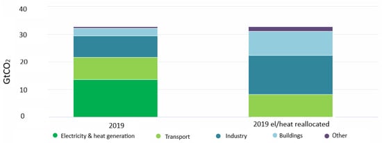 In recent years, the climate has become one of the most discussed topics in world politics. It is clear that CO emissions should be reduced drastically. Approximately 40% of total CO emissions worldwide are caused by the production of electricity and heat, as summarized in Figure 1 (left stacked bar chart) [].
