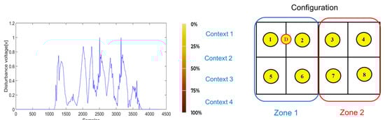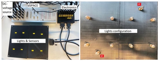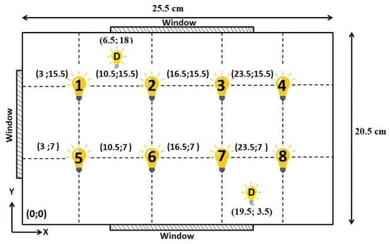 The laboratory test setup mimics the lighting structure in a typical office environment. This laboratory-scale system was inspired by that proposed in [] and simplified to a box with eight light bulbs and eight sensors, as depicted in Figure 2. The environment is composed of eight zones, each consisting of a lamp and a sensor distributed unevenly in each delimited room. This design permits us to consider “wall” constructions with varying heights for delineating the influence between zones of illumination and the superposition of light zones. Open environments or divided structures are possible to mimic, but an increased division of the zones will limit the influence between them. In addition, the performance of the box has been improved by adding two ways of simulating daylight, with the possibility of showing its effects on the test setup system, as a disturbance. The first one is to emulate the daylight electrically using the two additional lamps represented as “D” and the last one is using the windows on the sides of the box to allow daylight inside the rooms where we want to analyze its effects on the system. The positions of the lamps, windows, and sensors are presented in Figure 3.