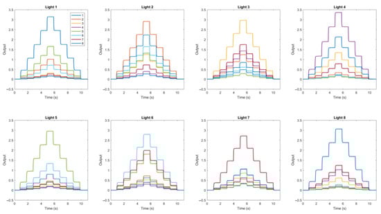The system is a strongly coupled dynamic multivariable process, in which the light intensity will cross-couple across zones of the setup area. To calculate the interaction coefficients, a staircase experiment was applied and the measured outputs of every light for the case with office walls (half-height) are depicted in Figure 5. The identification of these coefficients is performed as follows: a staircase signal is applied to the input of one zone, while the other zones are kept at a zero input. This is carried out once for each system’s input. The output values of each zone are plotted, resulting in a total of eight figures. The coefficients belonging to system i’s input and system j’s output are calculated as follows. First, the value of system j’s output at the third step of the staircase is determined from the experiment with system i as the input. The third step was chosen as it lies in the middle of the input range. Next, the obtained values are normalized with the output value of the third step of system 1 with system 1 as the input. Note that if the height of the walls is changed, the interaction gains are changed. An additional pseudorandom binary sequence (PRBS) test signal is used to perform identification.