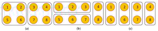 Various configurations for the office landscape area’s distribution of controlled zones. (a) 4/4, (b) 3/3/2, and (c) 2/2/2/2.