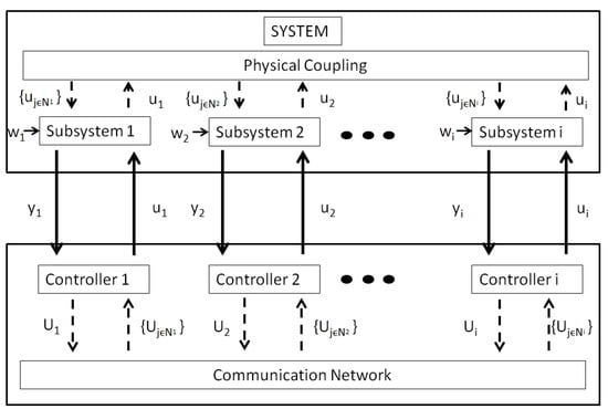 An effective distributed model predictive control (DiMPC) scheme was proposed in [], as illustrated in Figure 7. Every dynamic subsystem has its own controller, which calculates the optimal solution for its own subsystem, based on the information received from neighboring sub-systems. To reach the optimal solution, the optimization algorithm is performed iteratively.