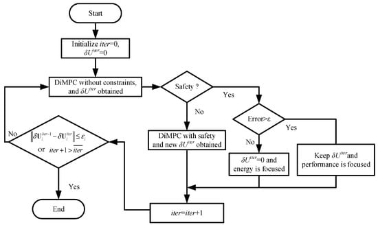 Multi-objective distributed control has a generic baseline structure that consists of three sequential layers: safety, tracking performance, and energy [,]. Obviously, the highest priority is assigned to safety. The flowchart is shown in Figure 8.
