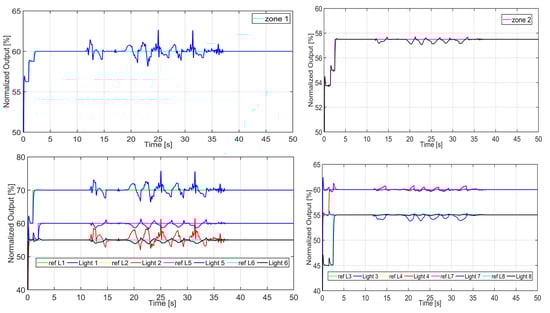 The results of the controller are given in Figure 14 for the output of Zone 1 and Zone 2. It can be observed that despite the strong interaction between the zones and the external light disturbance, the controller tracks the setpoint in both areas.