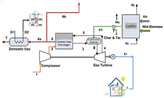 which is the formation enthalpy in kJ/kmol, its value in the reference state is zero for all chemical compositions, and the enthalpy difference between the given state and the reference state [3]. The RGT power plants comprise four parts: compressor, combustion chamber (CC), turbine, and generator. The integrated biomass regenerative combined cycle arrangement considered in Figure 1 demonstrates how to utilize the hot turbine exhaust gas. The fresh atmospheric air from the surroundings is filtered and drawn continuously into the circuit; the energy is added by fuel combustion in the chamber unit [35]. The combustion products are spread through the turbine [55] and consequently produce electrical work, while the rest of the exhaust gases are discharged into the Biomass Gasifier and Regenerator Units. The needed power output of the gasifier, Q (MWth), is an essential input parameter set by the client [17]. Based on this, the designer calculates the amount of fuel to feed into the gasifier and the amount of gasifying medium required. The volume flow rate of the product gas, Vg (Nm3/s), is calculated by subtracting its lower heating value, LHVg (MJ/Nm3), from its ideal higher heating value, LHVg (MJ/Nm3) [17].