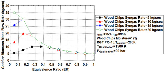 Variation of the equivalence ratio with gasifier’s biomass mass flow rate at different Wood Chip syngas rates.