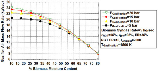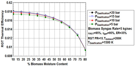 Important to note that increasing the biomass content leads to a sharp decrease in the gasifier’s efficiency. The simulation results observed that an increase in the syngas rate revealed an increase in the required biomass rate for gasification. However, the quality of the produced gas depends mainly on the amount of qualified air to achieve the high energy content of the gasification products [63]. Figure 3 displays the relationship between biomass moisture content and the RGT thermal efficiency at different gasification pressures (5–20 bar). As observed, the increase in the biomass moisture content leads to a sharp decrease in the RGT thermal efficiency.