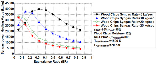 Lowering the moisture content of the biomass entering the gasifier raises the efficiencies of both the RGT and the Gasifier Unit. Further removal of the moisture will increase the chemical exergy of the product gas, and the physical exergy will be slightly increased [64]. The exergetic efficiency of the gasification process [17] decreases with the moisture content increase. In addition, with the increase in the moisture content, the CO2 and H2O production rate increases [65]. The increase in the gasification pressure has influenced the RGT thermal efficiency and the syngas LHV due to enhancement of the gasification reactions and the growth of the major constituents of the syngas product. Figure 4 shows the variation of the equivalence ratio (ER) with syngas lower heating value at different wood chips syngas rates (5–25 kg/s), at gasification pressure of 20 bar, the temperature of 1500 K, and moisture content of 12%. The profile exhibited an increase in the syngas LHV with the ER, till an optimum amount of the ER, subsequently the further increase in the ER has led to slow down the syngas LHV.