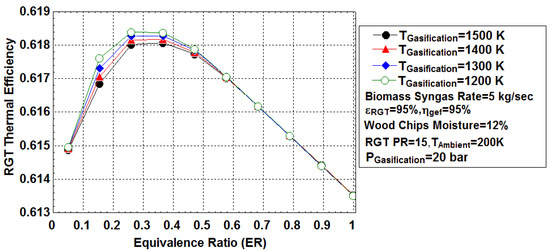 Effect of the equivalence ratio on the RGT thermal efficiency for different gasification temperatures.