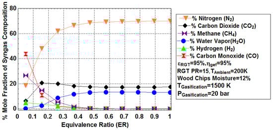 Consequently, the carbon reacts with CO and H2O vapor produces a lot of CO. However, the further temperature growth promotes combustion reactions and thus decreases of CH4 amount at the syngas [54,68] final products. Figure 6 presents the variation of the equivalence ratio (ER) and the percentage mole fractions of the syngas at a gasification temperature of 1500 K, pressure of 20 bar, regenerator effectiveness of 95%, gasifier efficiency of 95%, moisture content of 12%, and a produced amount of 5 kg/s syngas. The influence of the significant parameter, ER, is displayed and observed.