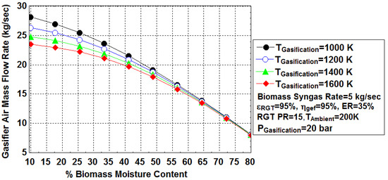 The influence of the biomass moisture content on the RGT actual gasification’s airflow rate can be observed in Figure 7. It is shown that the gasification air entered into the gasifier decreases amid the increase in the biomass moisture content. The biomass moisture content affects the quality of the consumed biomass. At a constant ER and syngas rate, increases in moisture content led to a decrease in the energy content of the syngas and an increase in the amount and the demand of the biomass flow rates, thus influencing a lower demand for the required air for the complete gasification process.