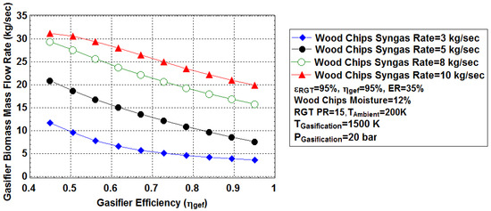 Further reduction in the gasification’s air amid increasing the biomass moisture content will diminish the gasification process and produce an unqualified syngas final product. In addition, the results demonstrate that increasing the gasification temperature has slowed down the amount of the actual air required for gasification. Literature data revealed that, as the initial moisture content increases, the gasification temperature slows down due to changes in the syngas composition and the effect of the water–gas shift, Boudouard, and combustion reactions [69,70,71]. Moreover, the influence of the gasification pressure resulted in an increase in the amount of the actual air required for gasification (see Figure 8) since the biomass flow rate is higher at a higher gasification pressure. With air used as a gasification medium, it was observed that the increase in the gasification pressure led to an acceleration of the reaction rate and the product’s conversion of the gasification reactions. Figure 9 shows the influence of the gasifier efficiency on the biomass flow rate for the gasification process. At different syngas rates (3–10 kg/s), an optimum ER of 35%, gasification temperature of 1500 K, pressure of 20 bar, and moisture content of 12%, the results predicted that the Acacia Nilotica Wood Chip biomass flow rate required for a complete gasification process decreases amid increases in gasifier efficiency. In addition, the demand for a higher biomass flow rate is attained at higher Wood Chip syngas rates. The irreversibilities of the gasifier are attributed to various factors during the gasification process, such as the quantity of the biomass flow rate, friction losses, pressure drops, releases of the high amount of gases, water corrosion, scale formation, the fusion of metals, tar and char formations, etc. In addition, results show that there is an optimum gasifier efficiency, in which the assigned biomass flow rate should be identified to minimize the possible source of irreversibilities at the gasification process.