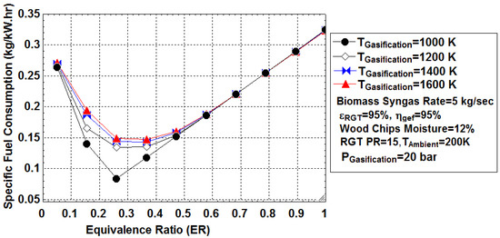 Variation of equivalence ratio with the specific fuel consumption at different gasification temperatures.