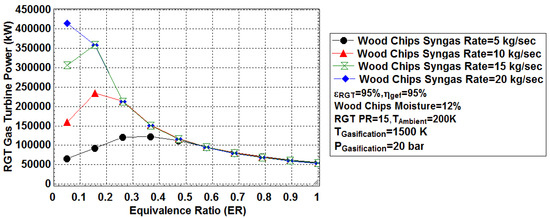 As plotted in Figure 10, at different gasification temperatures (1000–1600 K), pressure of 20 bar, biomass moisture content of 12%, and syngas rate of 5 kg/s, the ER shows a significant impact on the specific fuel consumption (SFC) of the RGT power plant. With ER growth at lower levels, the specific fuel consumption (SFC) of the RGT Unit sharply declines from the maximum value of 0.27 kg/kW·hr at an ER of 5% to the minimum value of 0.80 kg/kW·hr at an ER of 25% for the lowest gasification temperature of 1000 K. The results show that there is an optimum ER for each gasification temperature that ensures minimizing the SFC of the RGT power plant. Beyond the optimum ER, the trends predicted an inflection point, which exhibited an increase in the SFC. This is attributed to the excess amount of air released, resulting in more combustion reactions, changing the syngas composition, and slowing down the syngas’ lower heating value. The SFC of the RGT power plant reached 0.30 kg/kW·h at the higher ER of 95%. In addition, the results show that the SFC remains low at lower gasification temperatures. The influence of the ER on the RGT power plant at different syngas rates is shown in Figure 11. The simulation model revealed that ER growths at lower levels significantly affect the RGT power. The optimum ER delivered the highest RGT power, after which the syngas composition and combustion reaction will diminish the power due to a decrease in the LHV of the syngas fuel. At an ER of 5%, maximum power of 400 MW is reached at Acacia Nilotica Wood Chips’ syngas rate of 20 kg/s, whereas minimum power is reached at 50 MW for a syngas rate of 5 kg/s.