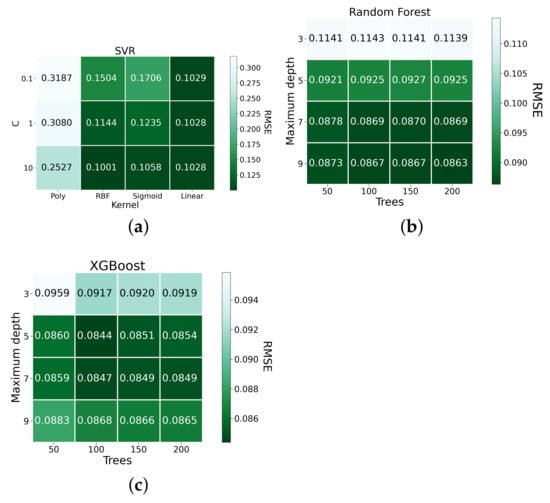 RMSE grid search result for (a) SVR; (b) Random Forest; and (c) XGBoost.