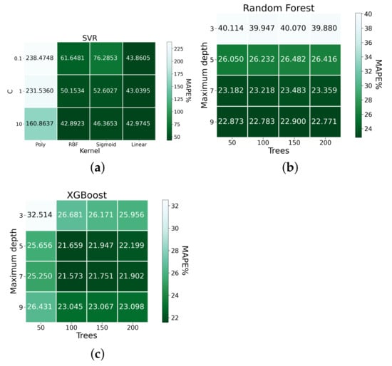 MAPE grid search result for (a) SVR; (b) Random Forest; and (c) XGBoost.