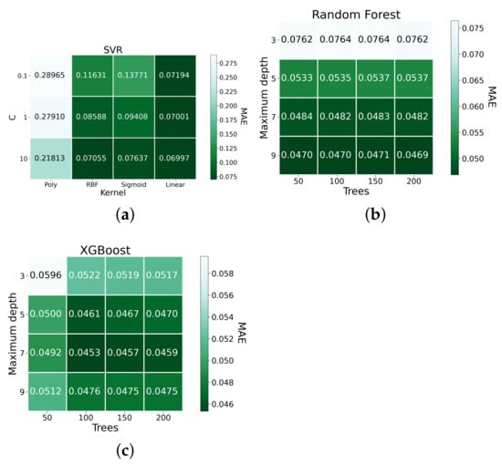 MAE grid search result for (a) SVR; (b) Random Forest; and (c) XGBoost.
