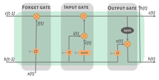 LSTM overcomes the main limitation of RNNs by introducing the cell state and gates into RNN cells which preserve weights propagated through time and different layers []. More specifically, an LSTM network uses three main gates, namely a forget gate, an input gate, and an output gate. Figure 5 provides an overview of the typical LSTM architecture. The forget gate is responsible for deleting information that is no longer useful in the unit []. At each time step, the input and the output from the previous unit are multiplied by the weight matrix. The result then goes through an activation function that generates a binary output that causes the information that is no longer useful to forget . The input gate instead provides useful information to the unit’s status. The information is initially adjusted by the sigmoid function and then the tanh function is used to create a vector whose values range between −1 and +1. Finally, the output gate completes the information extraction from the current state by applying a tanh function to a cell. Through these steps, LSTM models are able accurately predict time series with intervals of unspecified duration []. However, LSTM is not without limitations. As LSTM models take a long time to train [], GRU models are being increasingly used as alternatives.