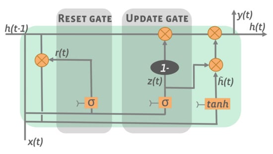 GRUs are quicker to train and are also capable of reaching performance comparable to LSTMs as they are able to capture both long- and short-term dependencies in a time series [,]. GRUs are less complex than LSTMs as they only use two gates, namely the update and reset gate [] (see Figure 6). GRU models transfer time dependencies in the data between different time steps by a single hidden state [].