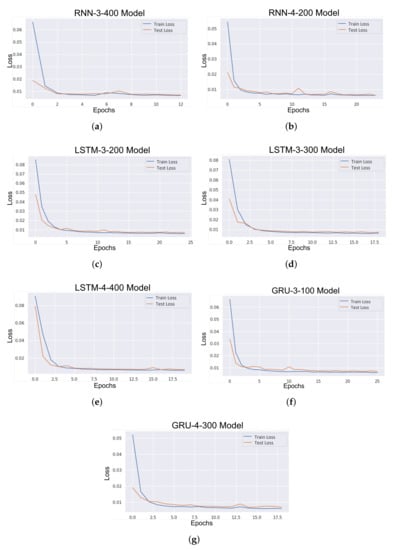 Convergence results for the (a) Recurrent Neural Network (RNN)-3-400; (b) RNN-4-200; (c) Long Short-Term Memory (LSTM)-3-200; (d) LSTM-3-300; (e) LSTM-4-400; (f) Gated Recurrent Unit (GRU)-3-100; and (g) GRU-4-300.