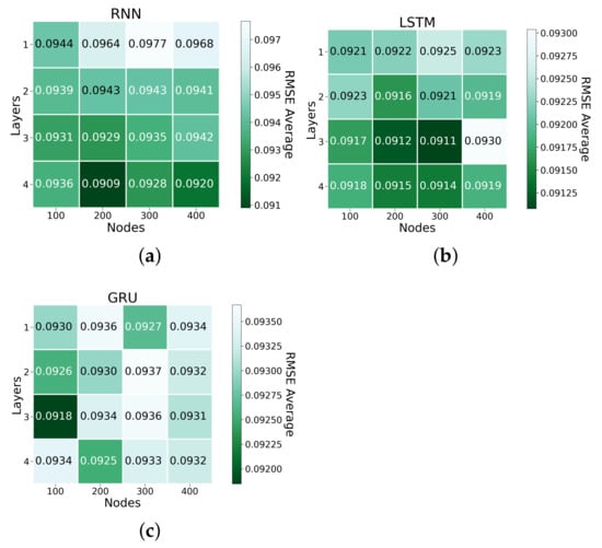 RMSE grid search result for (a) RNN; (b) LSTM; and (c) GRU.