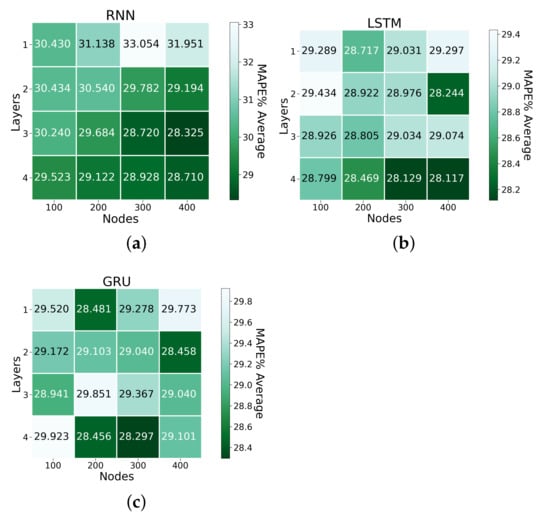 MAPE grid search result for (a) RNN; (b) LSTM; and (c) GRU.