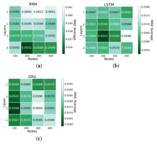 MAE grid search result for (a) RNN; (b) LSTM; and (c) GRU.